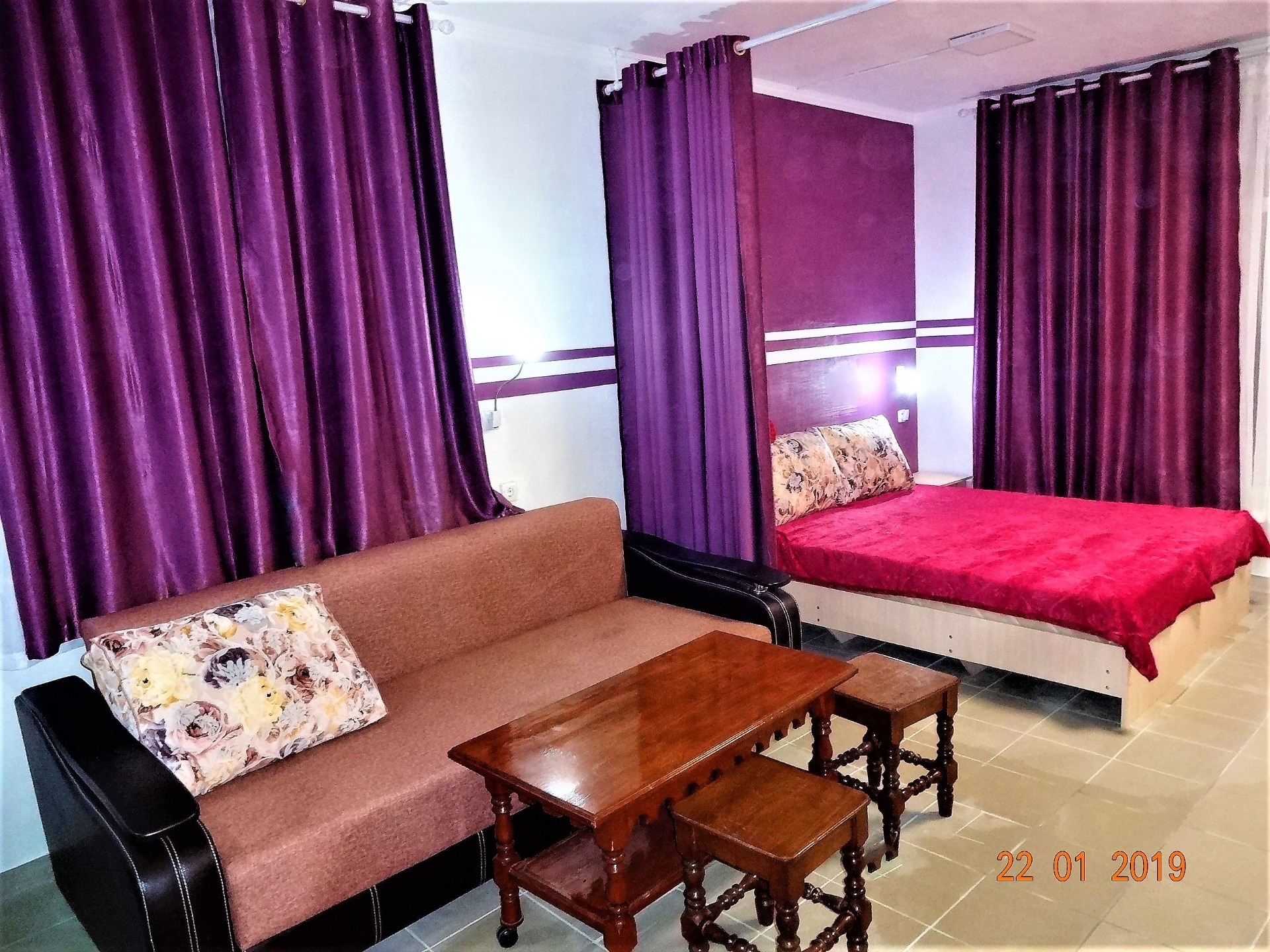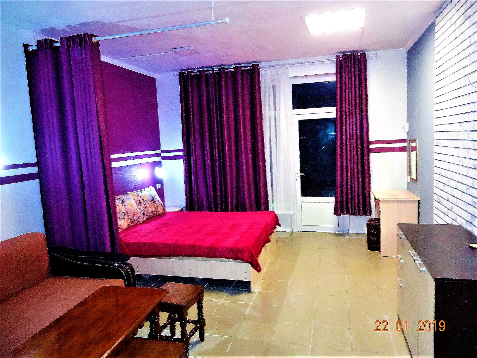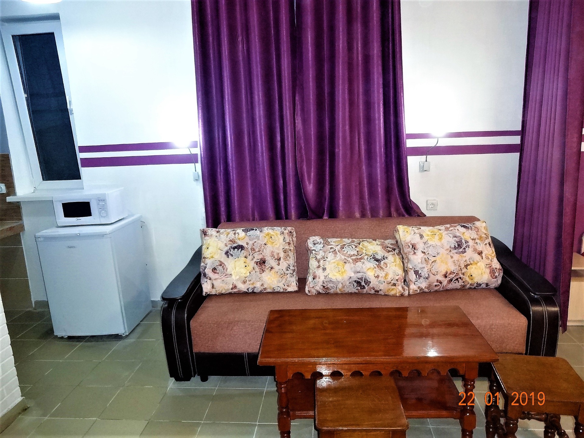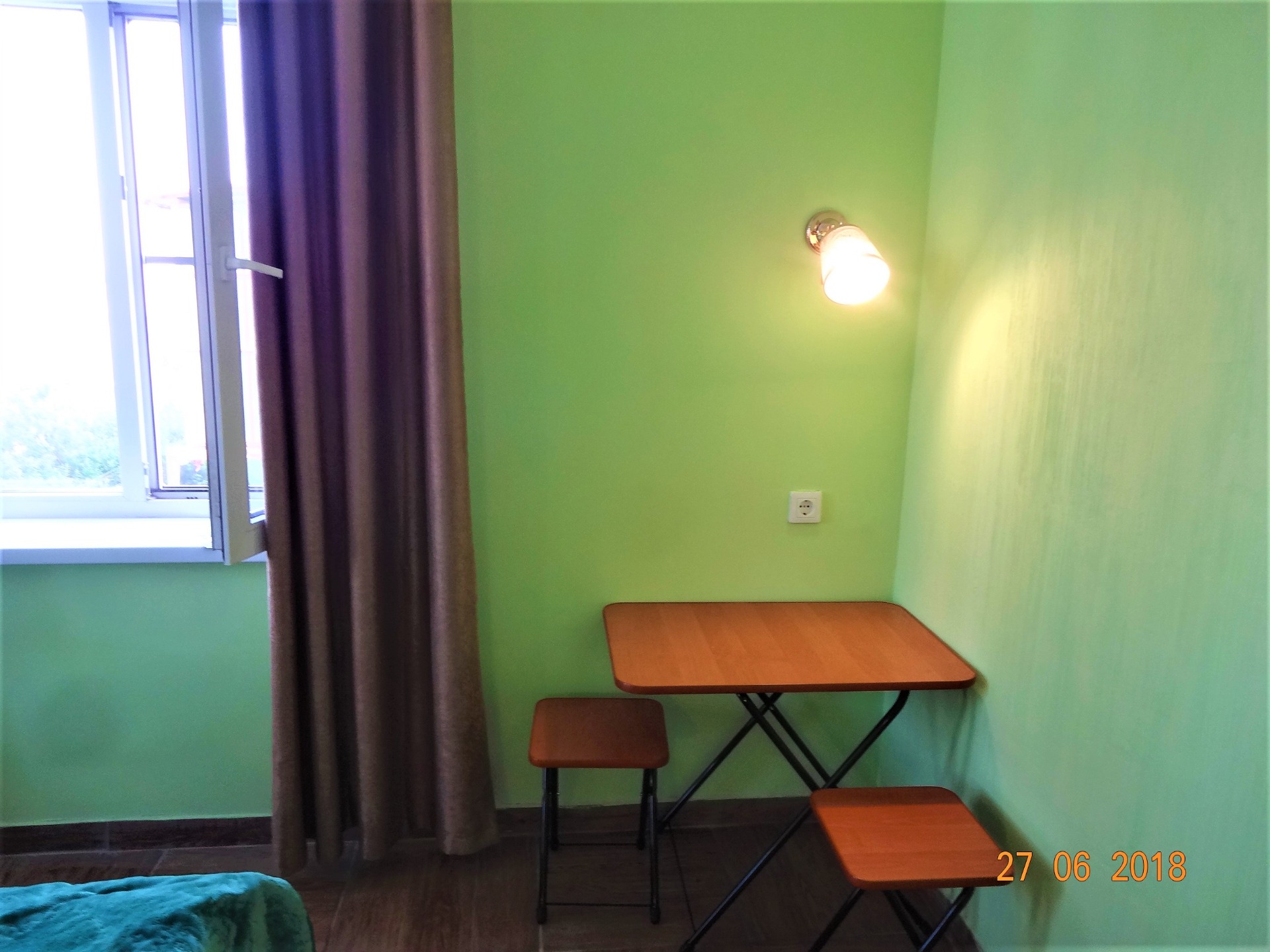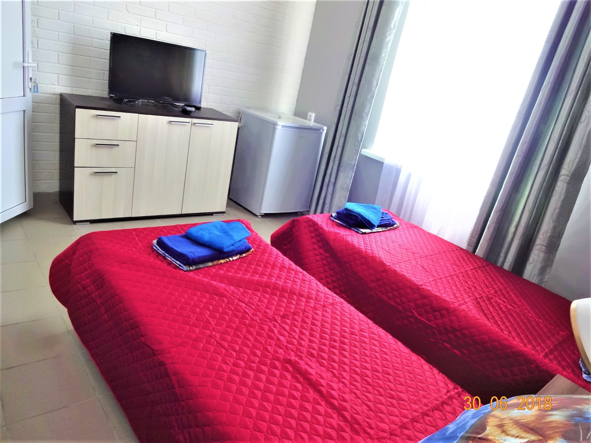 номер СИРЕНЕВЫЙ рассчитан на 4-х человек, в номере 2 односпальные кровати, большой диван, туалет, душ, сплит система, холодильник, ЖК ТВ, комод, шкаф для белья, туалетный столик с зеркалом, столик обеденный, стулья. В номере своя миникухня с посудой, эл. чайником, эл. плиткой, микроволновкой. Номер с отдельным входом со своей террасой со столом и стульями. Вид на детскую площадку и озеро.