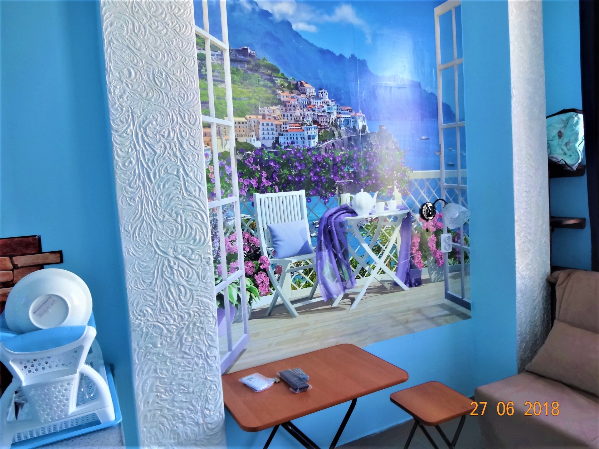 Номер 3-х комнатный, рассчитан на 6 человек, комнаты раздельные, в каждом номере две кровати или двух спальняя кровать, тумбочки, комод, ЖК ТВ, сплит система, холодильник. Большой балкон со столом и стульями с видом на озеро с фонтаном, детскую площадку и бассейн. Своя мини кухня.
